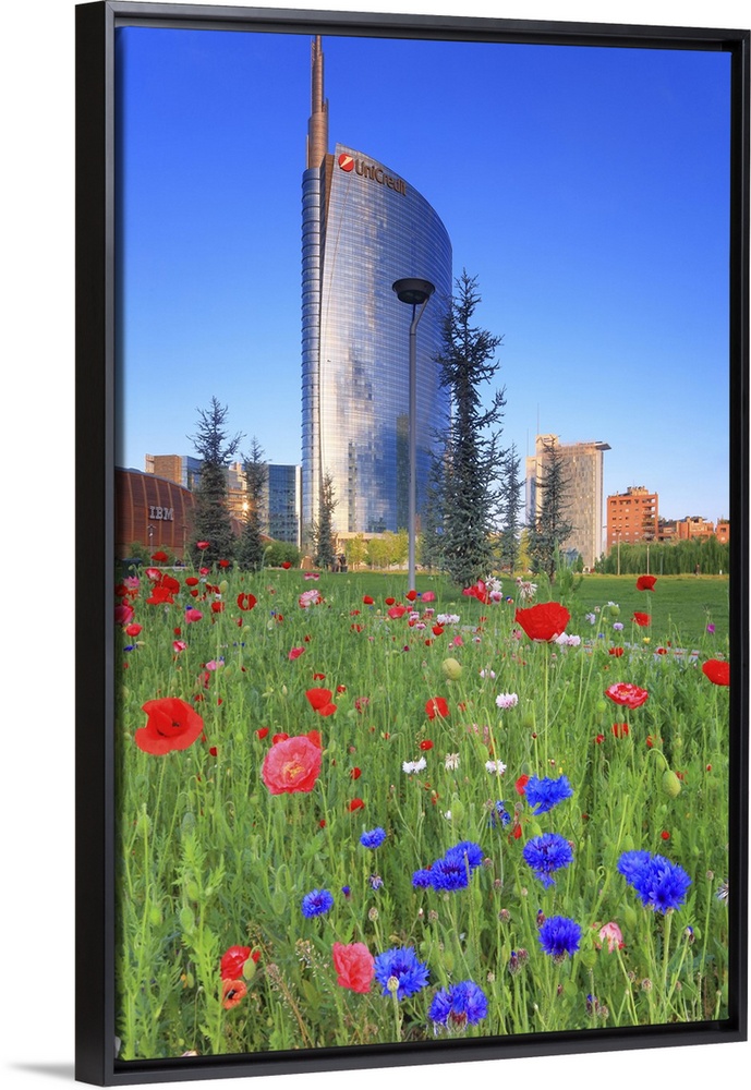 <p>Italy, Lombardy, Milano district, Milan, Porta Nuova, Flowers and the Unicredit Tower at dawn.</p>