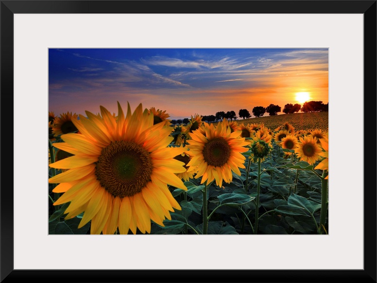<p>Italy, Marches, Macerata district, Sunflowers at sunset in the countryside near Morrovalle village.</p>