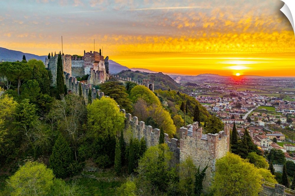 <p>Italy, Veneto, Vicenza district, Marostica, Aerial view of the Castle and the walled city of Marostica at dawn.</p>