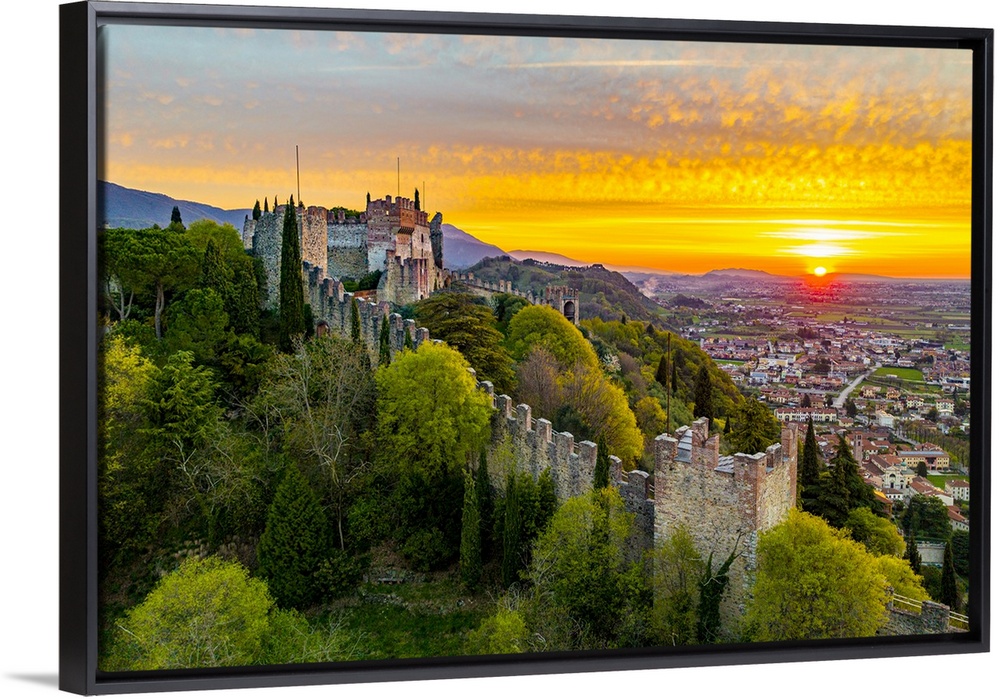 <p>Italy, Veneto, Vicenza district, Marostica, Aerial view of the Castle and the walled city of Marostica at dawn.</p>