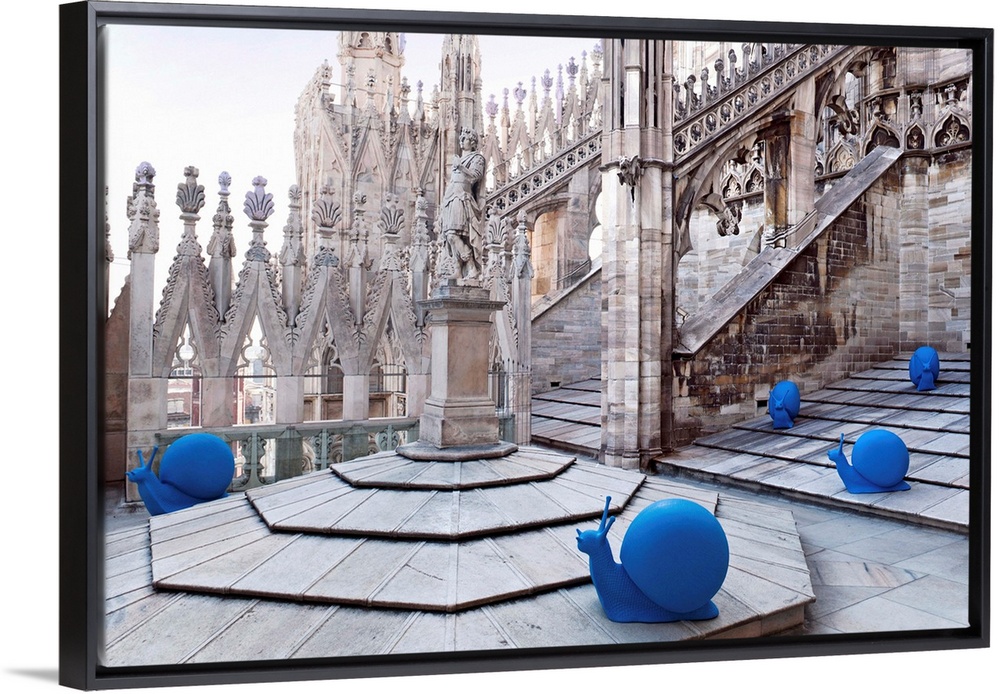 <p>Italy, Milan, Milan Cathedral, Blue plastic-made snails spread among the Cathedrals spires to gather funds for restorations.</p>