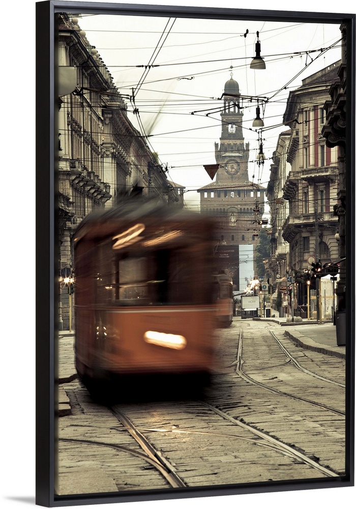 <p>ITALY, Milan Province, Milan. Milan trams on Via Orefici with Castello Sforzesco, dawn.</p>