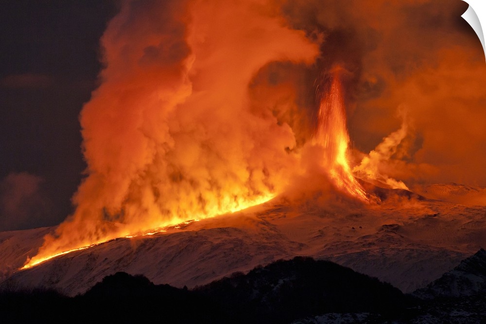 <p>Italy, Sicily, Catania district, Mount Etna, Etna 2nd paroxysm activity of 2012, a lava flow meets snow forming huge clouds of vapor illuminated in red..</p>