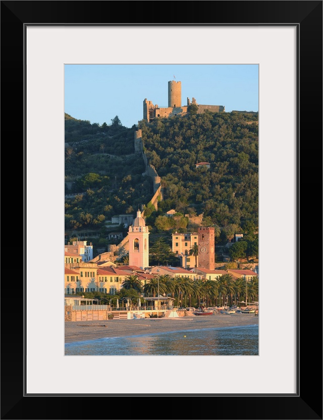 <p>Italy, Liguria, Mediterranean sea, Ligurian sea, Ligurian Riviera, Riviera delle Palme, Mediterranean area, Savona district, Riviera di Ponente, Noli, Cathedral bell-tower and Castello Ursino on top of the hill.</p>