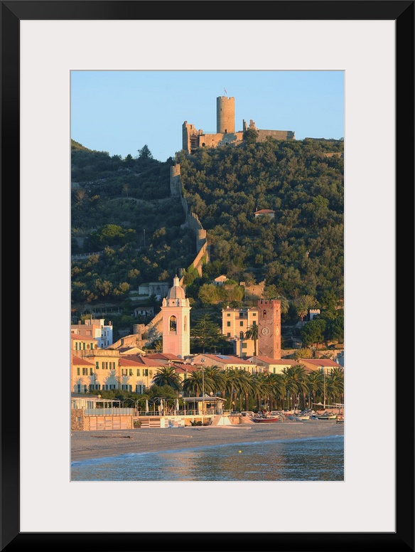 <p>Italy, Liguria, Mediterranean sea, Ligurian sea, Ligurian Riviera, Riviera delle Palme, Mediterranean area, Savona district, Riviera di Ponente, Noli, Cathedral bell-tower and Castello Ursino on top of the hill.</p>
