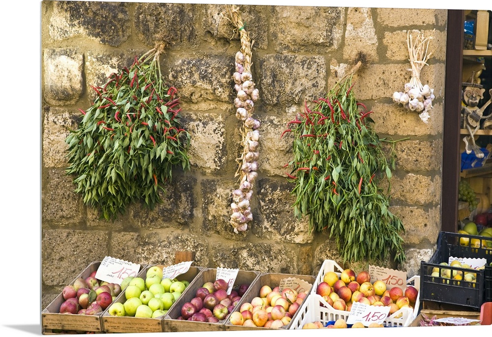 <p>Italy, Orvieto. Fruit displayed for sale out side of small shop.</p>