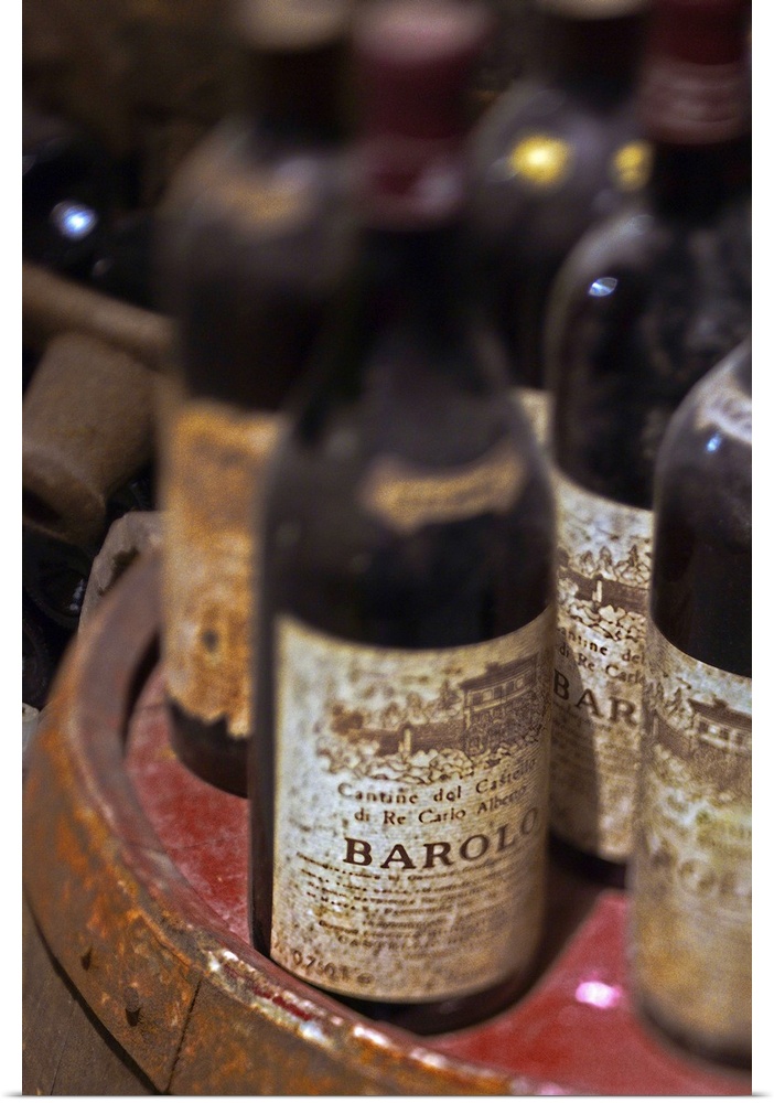 <p>Italy, Piedmont, Colline del Barolo, Langhe, Verduno, Old bottles of Barolo wine</p>