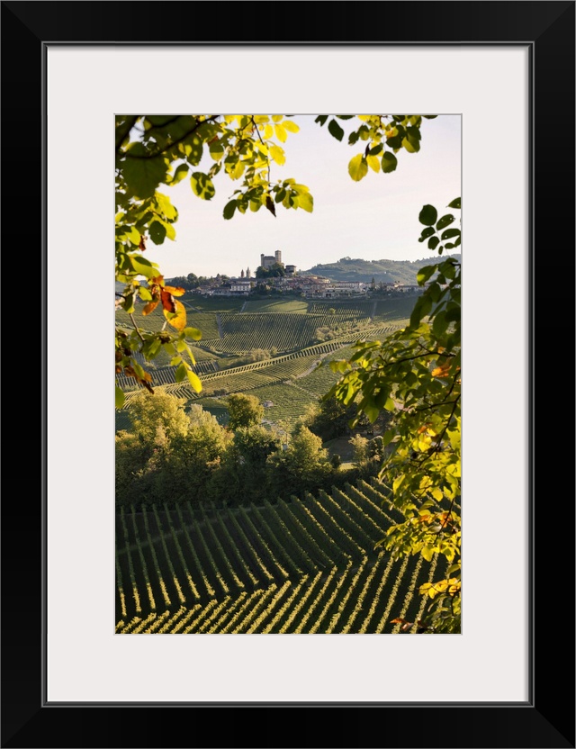 <p>Italy, Piedmont, Cuneo district, Langhe, Serralunga d'Alba, Landscape of vineyards hills and the village</p>
