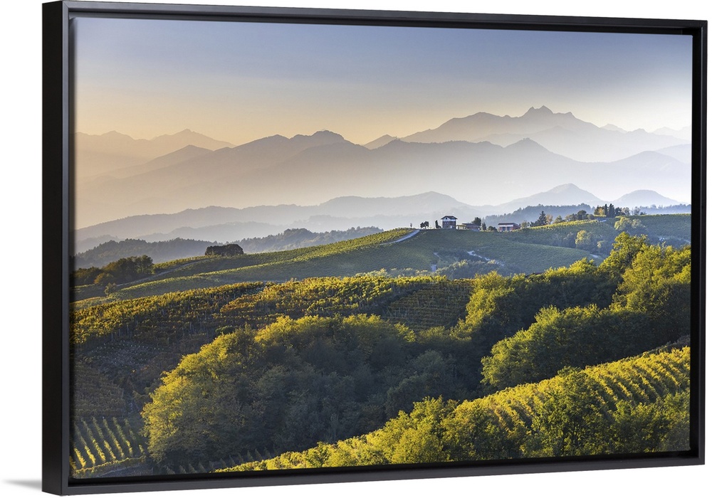 <p>Italy, Piedmont, Vercelli district, Alps, Alto Piemonte, Gattinara, The hills of the Nebbiolo vineyards in Gattinara and the Biella Alps above the city of Biella in the background.</p>