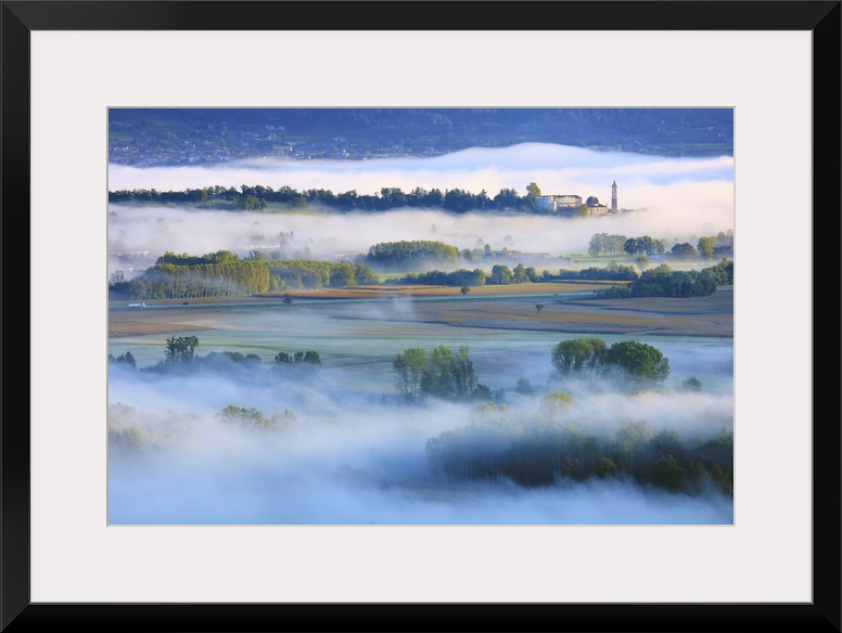 <p>Italy, Piedmont, Canavese region, view from Masino (fraction of Caravino) towards the village of Azeglio and the morning mists that cover the plains between Ivrea and Lake Viverone.</p>