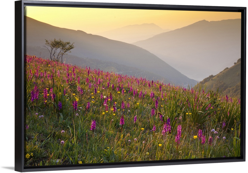 <p>Italy, Umbria, Forca Canapine. Pink orchids growing at the Forca Canapine, Monti Sibillini National Park, bathed in dawn light.</p>