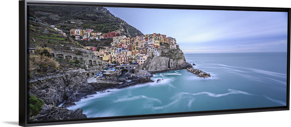 <p>Italy, Liguria, La Spezia district, Riviera di Levante, Cinque Terre, Mediterranean sea, Ligurian sea, Ligurian Riviera, Parco Nazionale delle Cinque Terre, Manarola in winter with rough sea.</p>