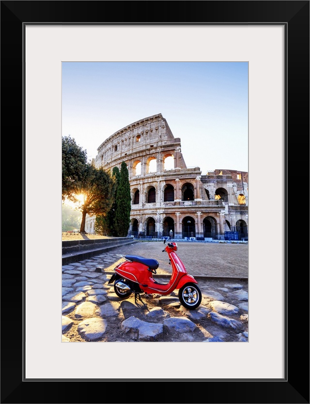 <p>Italy, Rome, a red Vespa motorbike in front of Colosseum at sunrise</p>