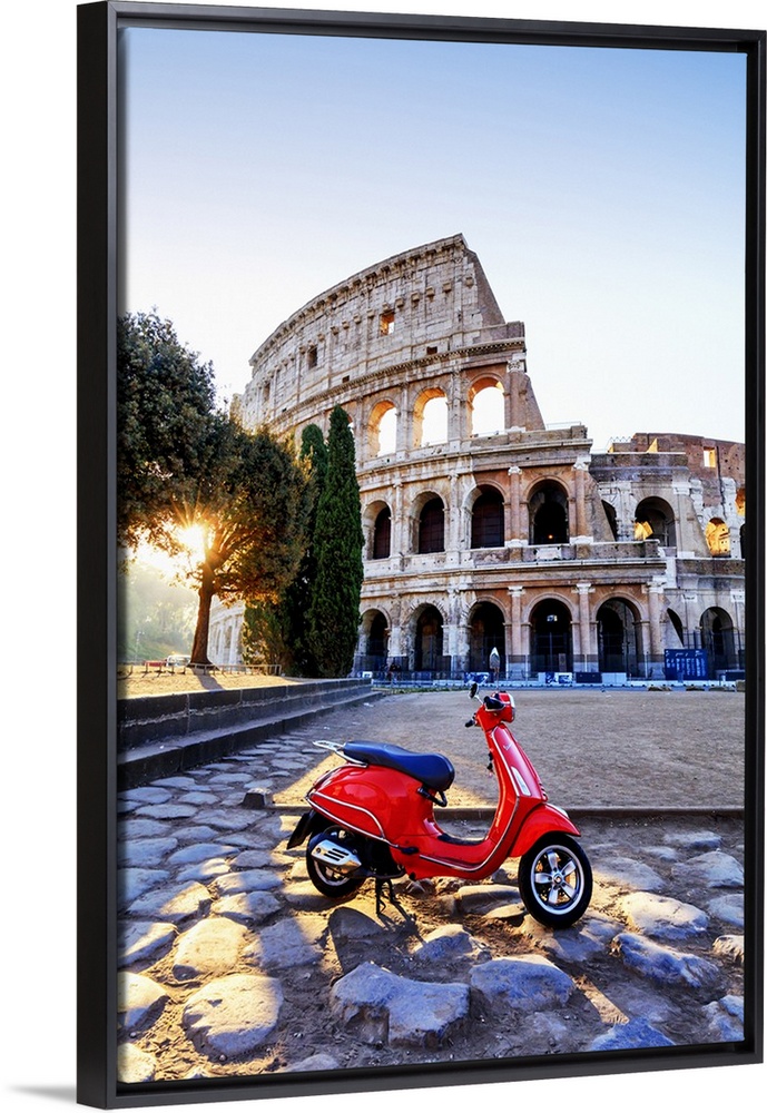 <p>Italy, Rome, a red Vespa motorbike in front of Colosseum at sunrise</p>