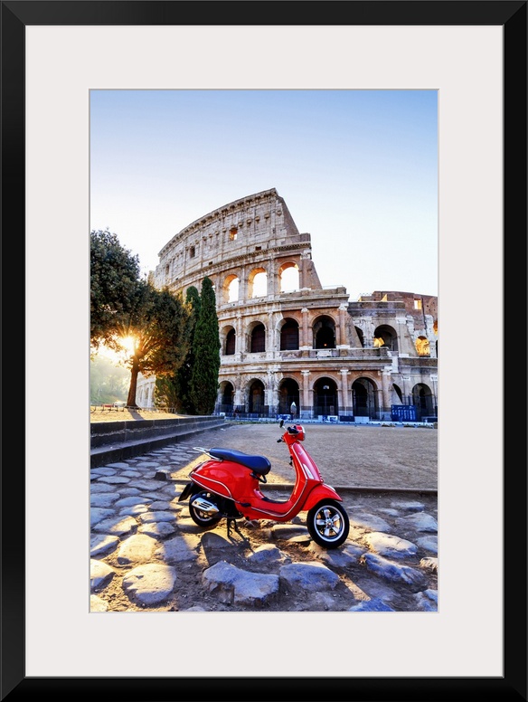 <p>Italy, Rome, a red Vespa motorbike in front of Colosseum at sunrise</p>