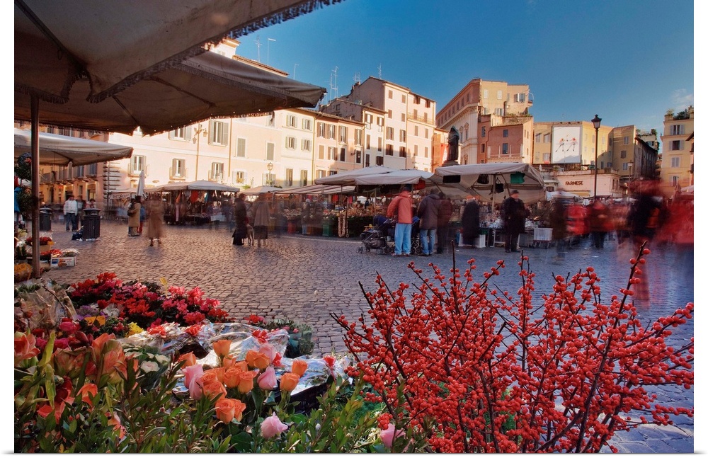 <p>Veduta dell'animata Campo de' fiori, con il mercatino floreale di origine medievale che da il nome a questa celebre piazza romana.</p>