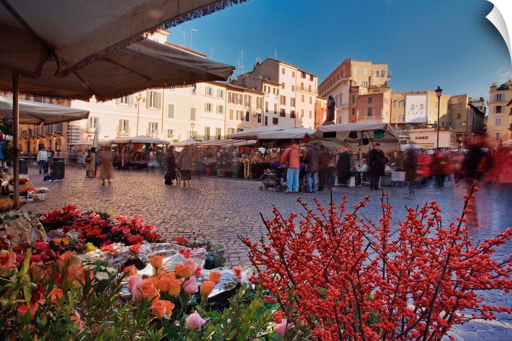 <p>Veduta dell'animata Campo de' fiori, con il mercatino floreale di origine medievale che da il nome a questa celebre piazza romana.</p>