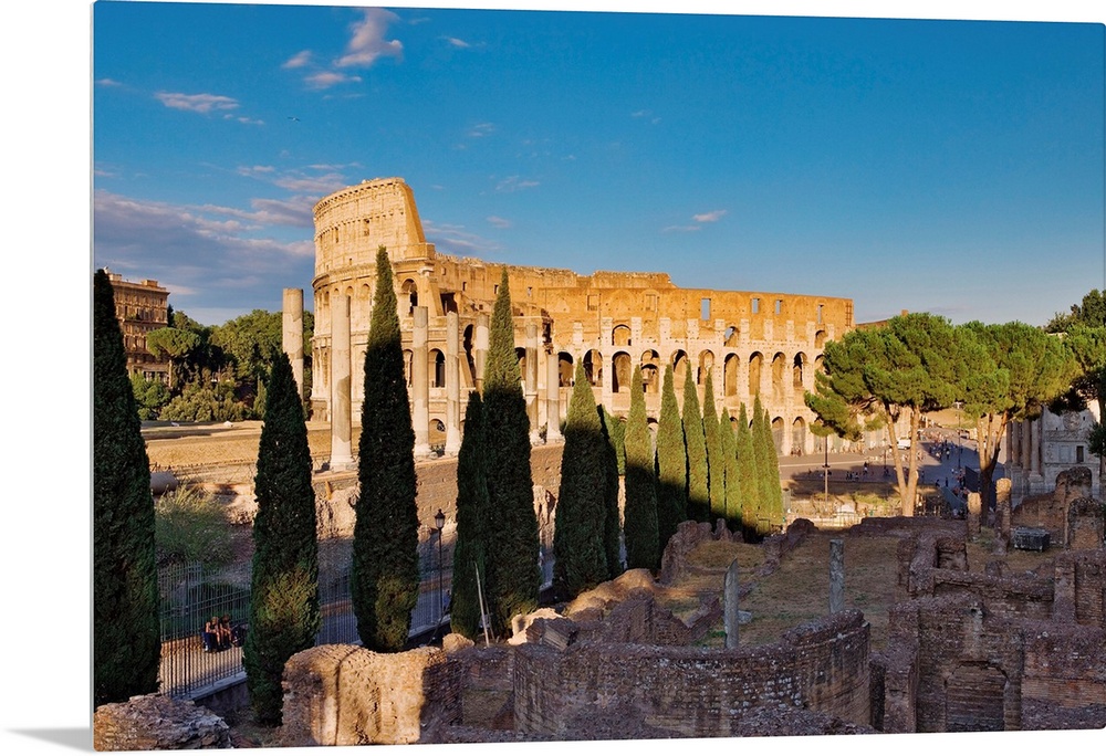 <p>Veduta del Colosseo dall'arco di Settimio Severo con in primo piano la via Sacra e le rovine del foro romano.</p>