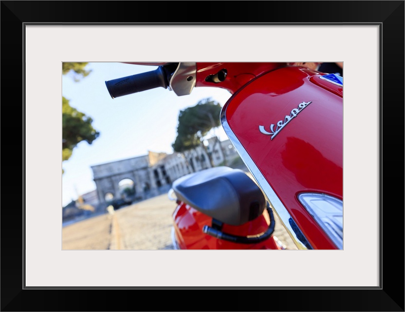 <p>Italy, Rome, a young couple on a red Vespa motorbike enjoying the sunset at Colosseum and Roman Forum</p>