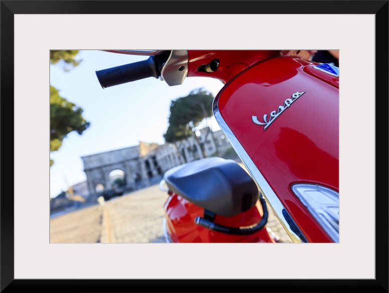 <p>Italy, Rome, a young couple on a red Vespa motorbike enjoying the sunset at Colosseum and Roman Forum</p>