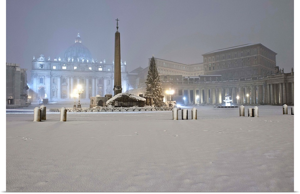 <p>Italy, Rome, St Peter's Basilica, Night view of the Square with snow.</p>