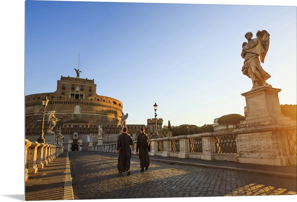 <p>Italy, Rome, two monks walking at Mausoleum of Hadrian (known as Castel Sant'Angelo) at sunrise</p>