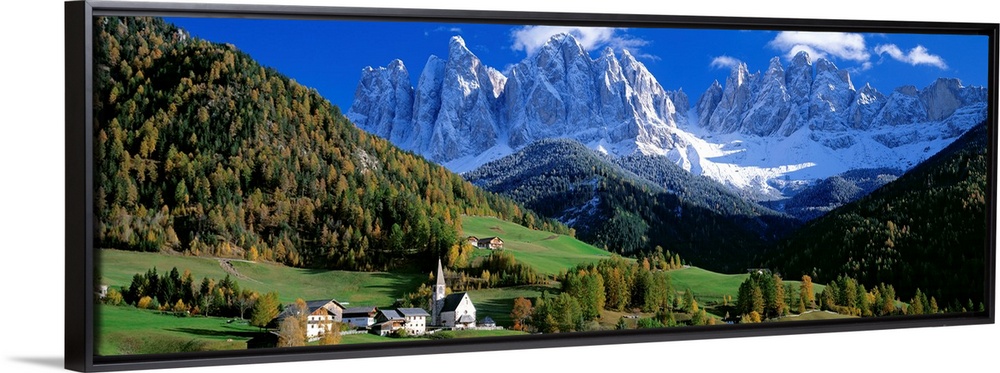 <p>The snow covered Alps tower over a quiet valley filled with conifer trees in this panoramic photograph.</p>