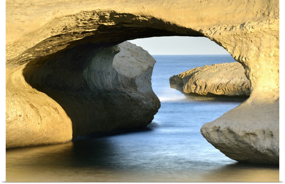 <p>Italy, Sardinia, Oristano district, Cuglieri, Mediterranean sea, First light of day above the natural arch of S'archittu.</p>