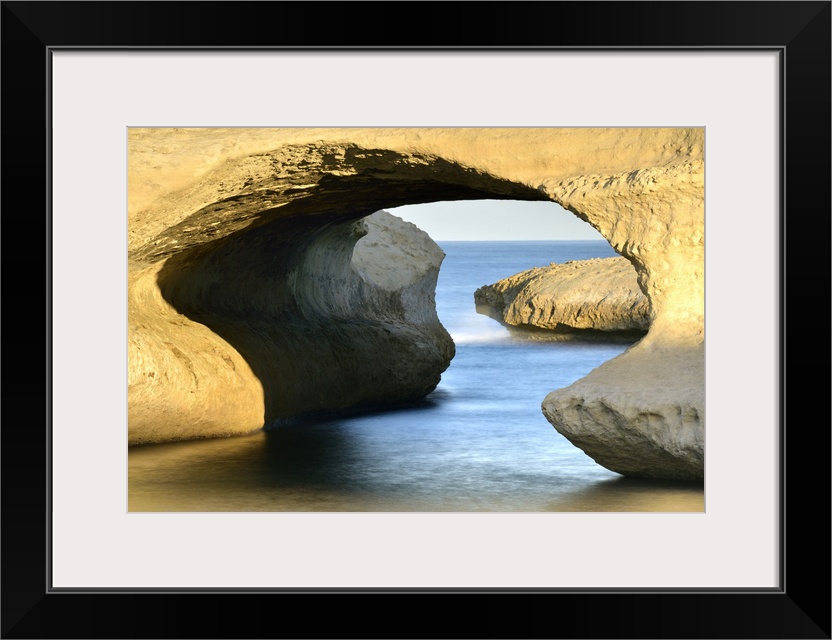 <p>Italy, Sardinia, Oristano district, Cuglieri, Mediterranean sea, First light of day above the natural arch of S'archittu.</p>