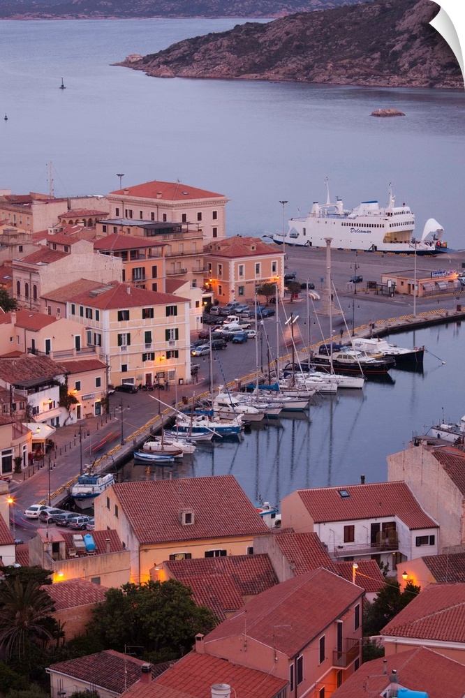 <p>Italy, Sardinia, Northern Sardinia, Isola Maddalena, La Maddalena, aerial port view from the hills, dusk</p>