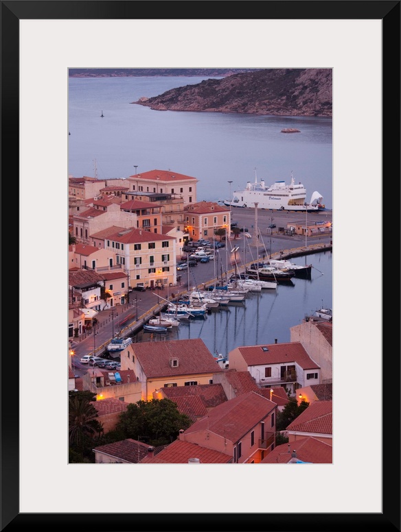 <p>Italy, Sardinia, Northern Sardinia, Isola Maddalena, La Maddalena, aerial port view from the hills, dusk</p>