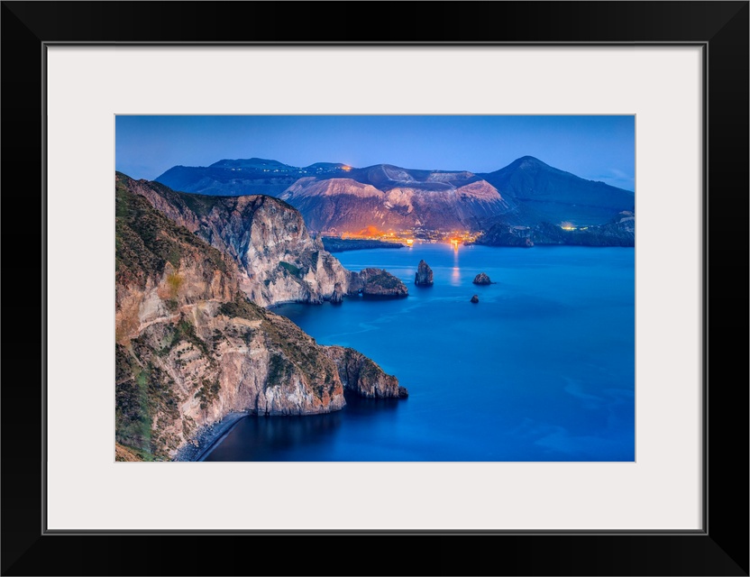 <p>Italy, Sicily, Messina district, Mediterranean sea, Tyrrhenian sea, Aeolian islands, Lipari islands, Lipari, View from Belvedere Quattrocchi towards Valle Muria beach, Vulcano island in background.</p>