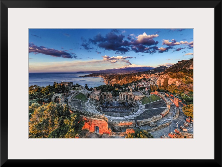 <p>Italy, Sicily, Messina district, Mediterranean sea, Tyrrhenian sea, Taormina, Aerial view of Taormina, the Greek Theater and Mount Etna in eruption, paroxysm of March 24, 2021.</p>