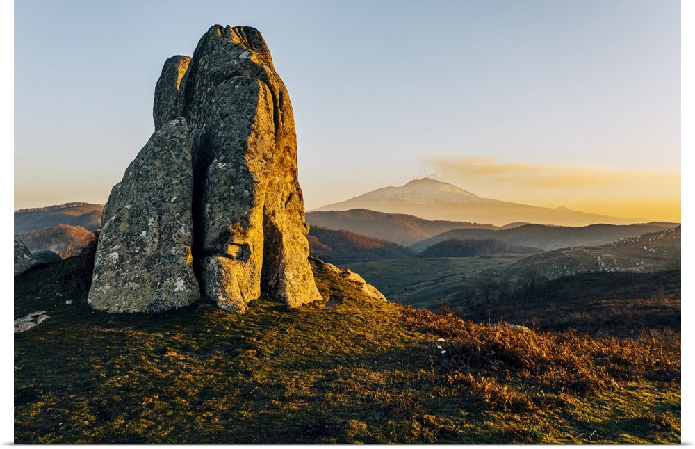 <p>Italy, Sicily, Messina district, Argimusco, Argimusco plateau at sunset with Mount Etna in the background.</p>