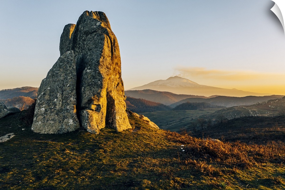 <p>Italy, Sicily, Messina district, Argimusco, Argimusco plateau at sunset with Mount Etna in the background.</p>