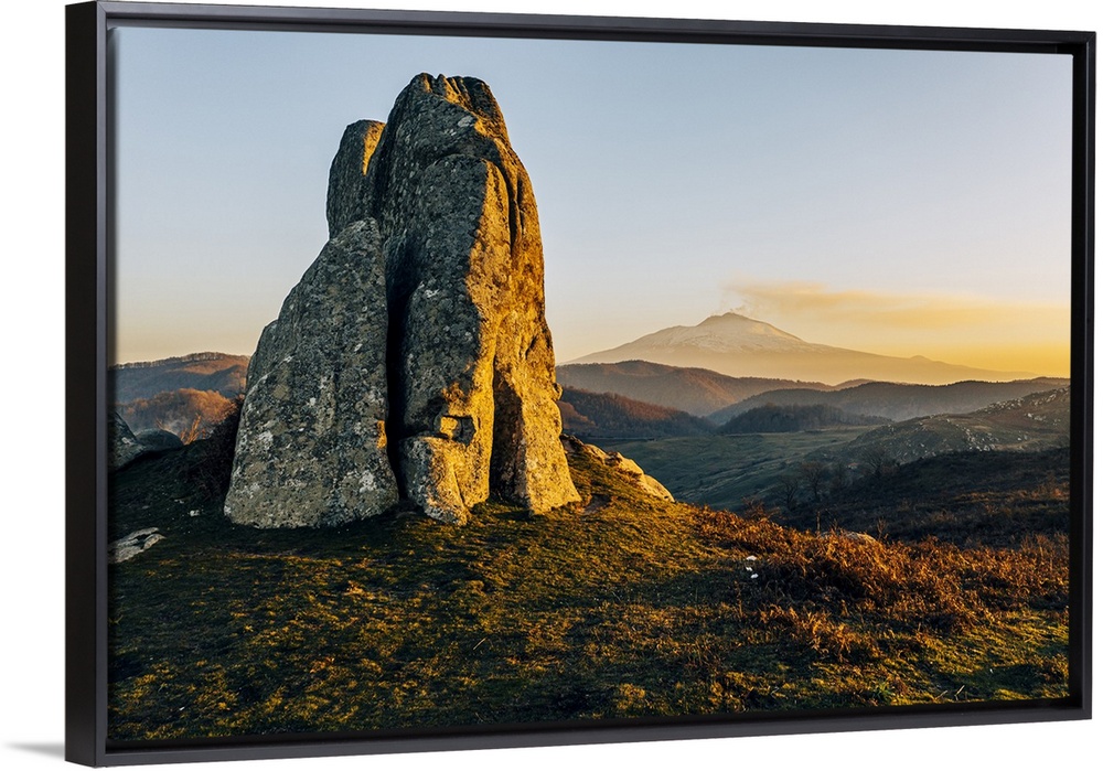 <p>Italy, Sicily, Messina district, Argimusco, Argimusco plateau at sunset with Mount Etna in the background.</p>