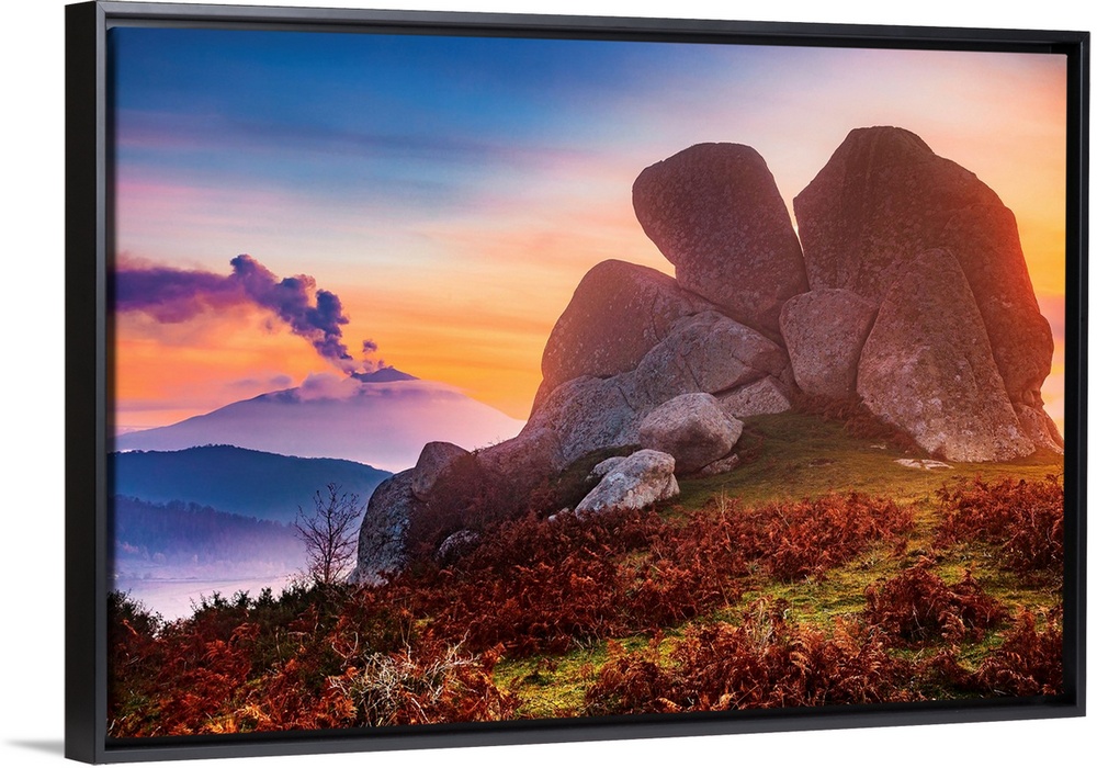 <p>Italy, Sicily, Argimusco, The Eagle, megalith of Argimusco near Montalbano Elicona and eruption of Mount Etna in the background.</p>