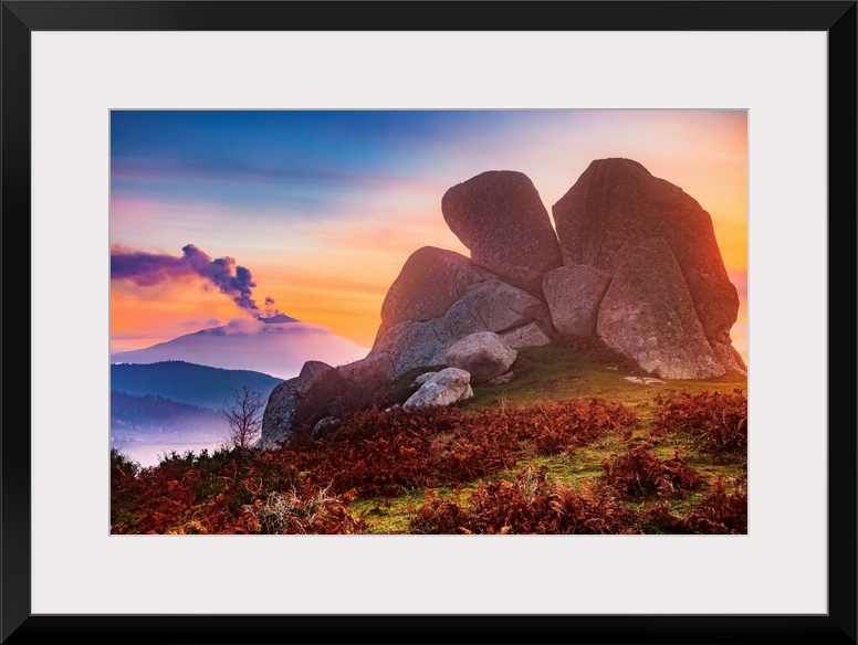 <p>Italy, Sicily, Argimusco, The Eagle, megalith of Argimusco near Montalbano Elicona and eruption of Mount Etna in the background.</p>
