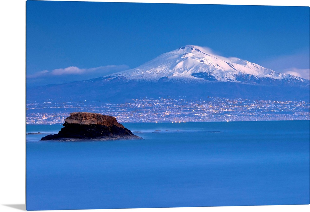 <p>Italy, Sicily, Catania district, Mediterranean sea, Catania, Baia del Silenzio, view towards Catania and Mount Etna</p>
