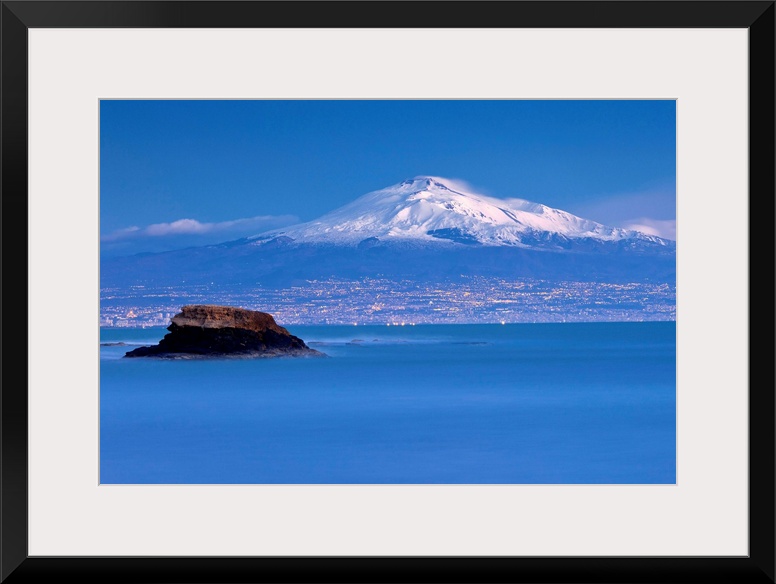 <p>Italy, Sicily, Catania district, Mediterranean sea, Catania, Baia del Silenzio, view towards Catania and Mount Etna</p>