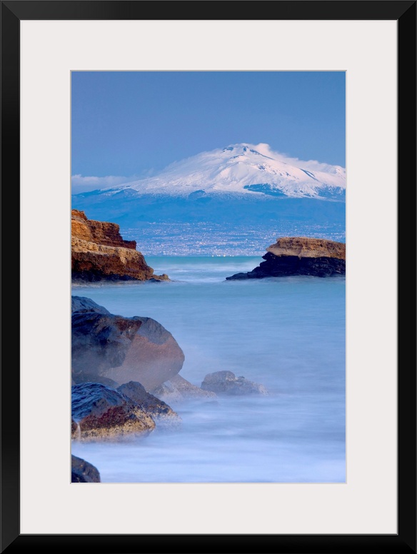 <p>Italy, Sicily, Catania district, Mediterranean sea, Catania, Baia del Silenzio, view towards Catania and Mount Etna</p>