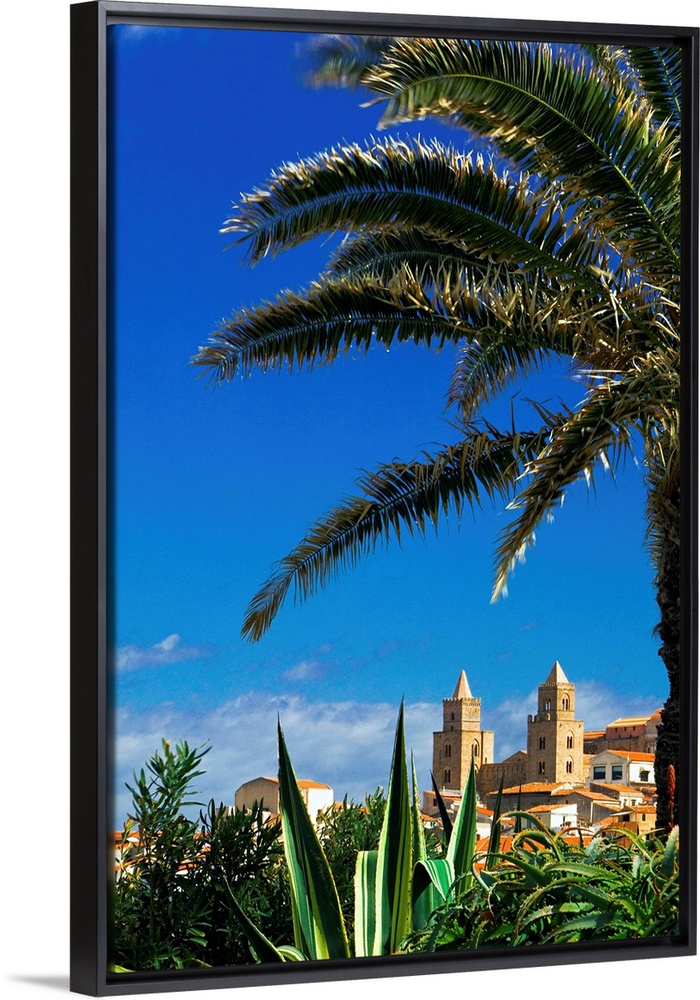 <p>Italy, Italia, Sicily, Sicilia, Cefal., palm tree and cathedral in background</p>