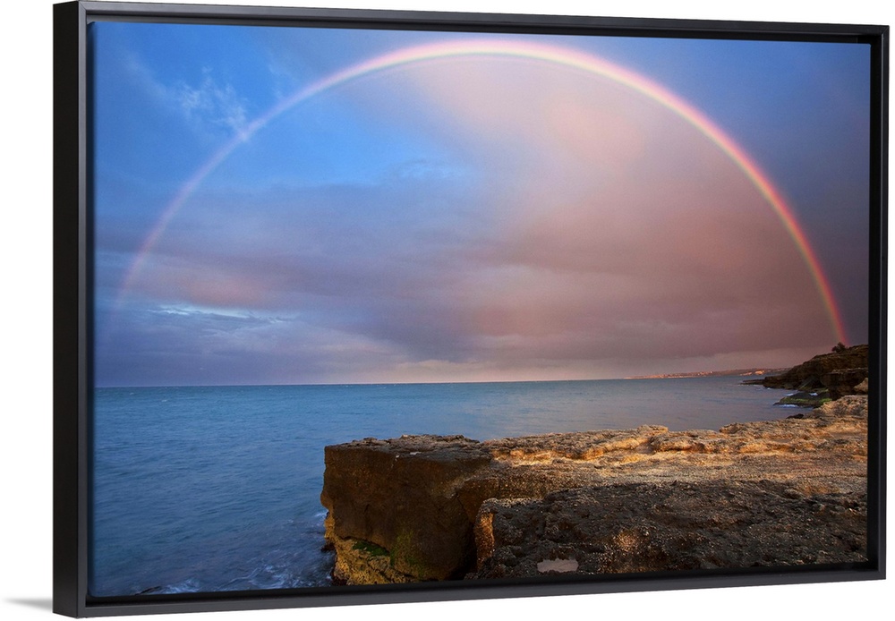 <p>Italy, Sicily, Mediterranean sea, Costa Saracena, Siracusa district, Augusta, Rainbow over the sea at sunset.</p>