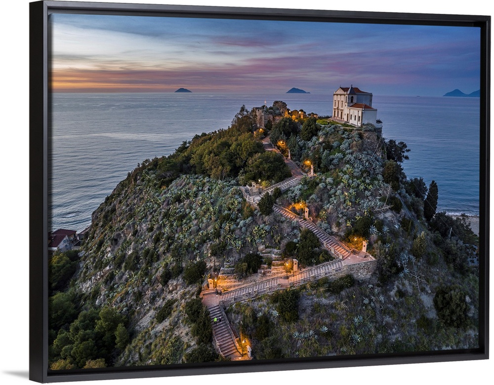 <p>Italy, Sicily, Mediterranean sea, Tyrrhenian sea, Costa Saracena, Messina district, Capo d'Orlando, Aerial of promontory, Church of Monte della Madonna & Aeolian Islands.</p>