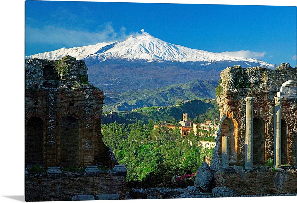<p>Italy, Sicily, Ionian Coast, Taormina, Greek theatre and Mount Etna in background</p>