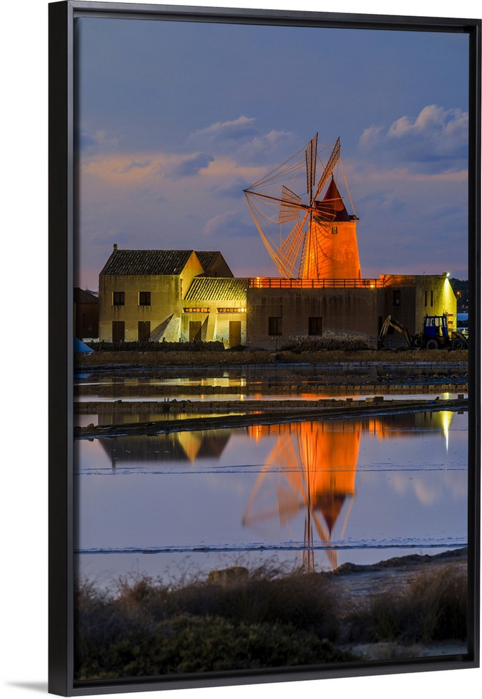 <p>Italy, Sicily, Trapani district, Marsala, Isole dello Stagnone, Windmills in the salt pans of the Stagnone di Marsala.</p>