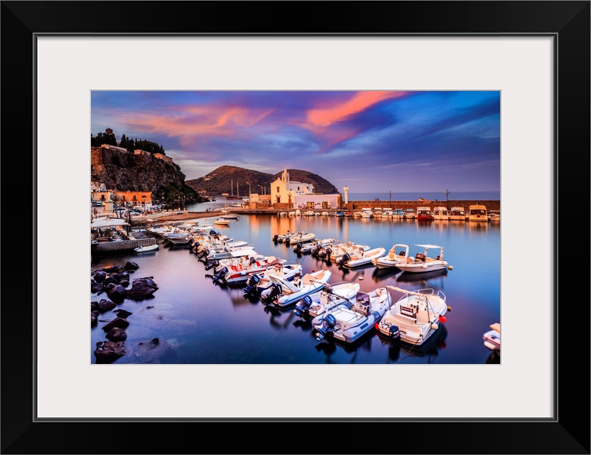 <p>Italy, Sicily, Messina district, Mediterranean sea, Tyrrhenian sea, Aeolian islands, Lipari islands, Lipari, Marina Corta at sunset.</p>