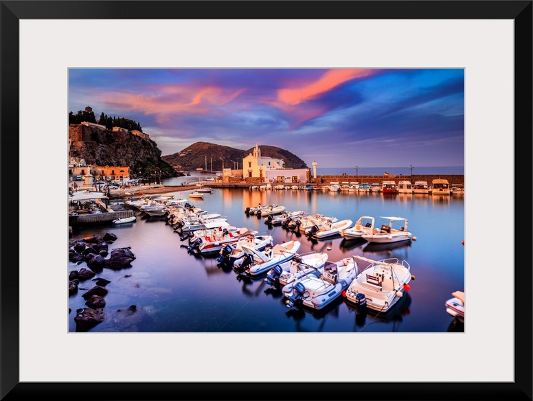 <p>Italy, Sicily, Messina district, Mediterranean sea, Tyrrhenian sea, Aeolian islands, Lipari islands, Lipari, Marina Corta at sunset.</p>