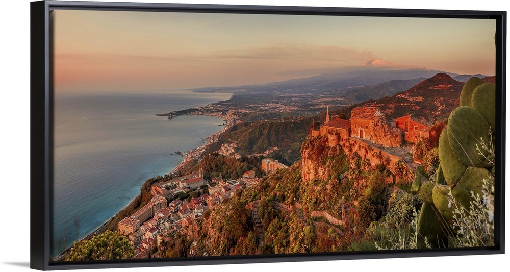 <p>Italy, Sicily, Mediterranean sea, Messina district, Taormina, Ionic Coast from Taormina to Catania with sanctuary of Madonna della Rocca and Mount Etna in the background.</p>