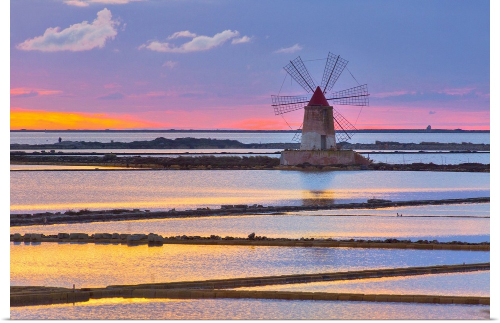 <p>Italy, Sicily, Trapani district, Marsala, Isole dello Stagnone, Mediterranean sea, Tyrrhenian sea, Mills at sunset at the Ettore Infersa Saline.</p>